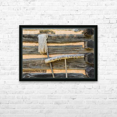 Get this artwork "Old rake and mop against log cabin" in a framed print.
