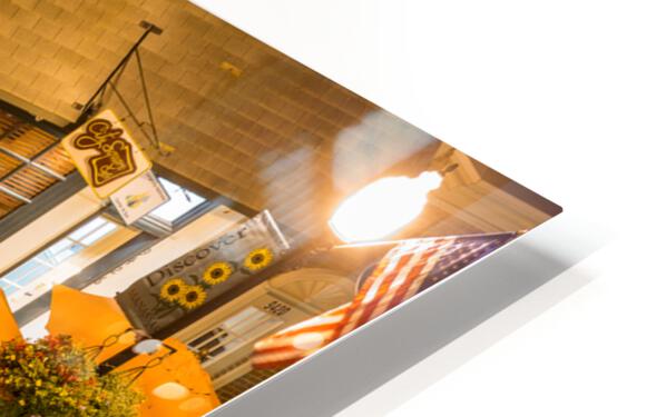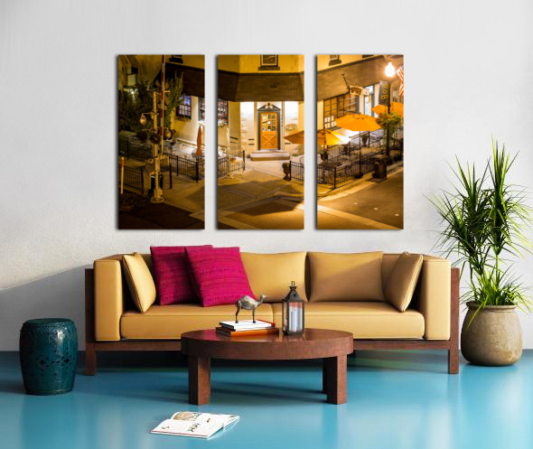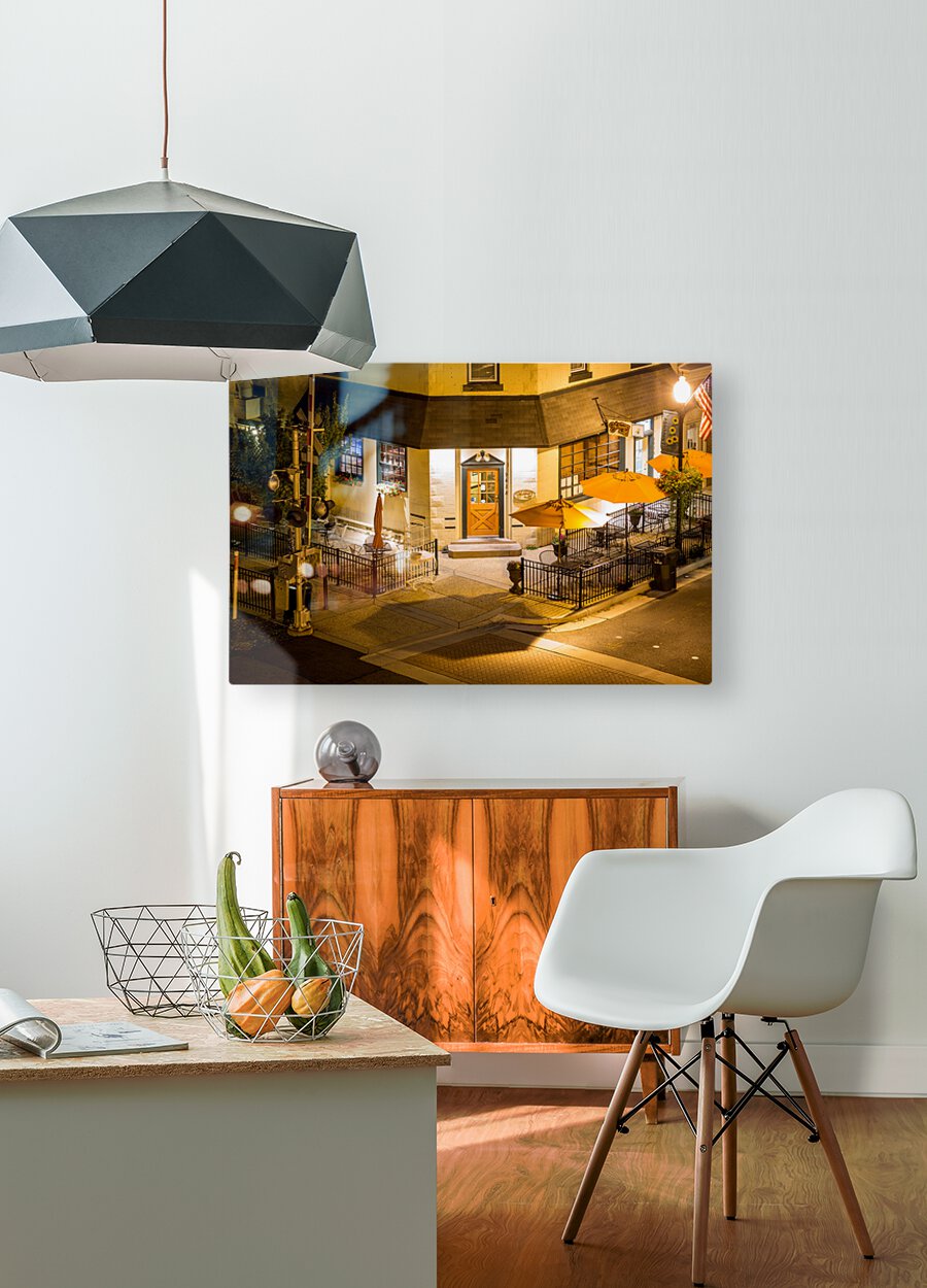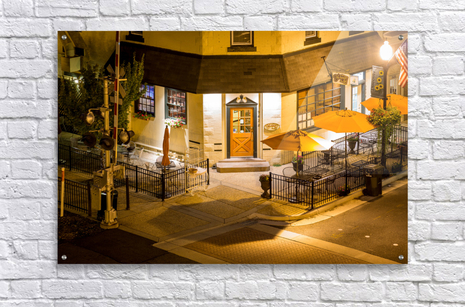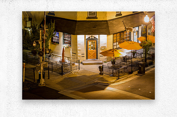 Evening view of Manassas town and local cafe or restaurant at sunset as the lights in the city come on