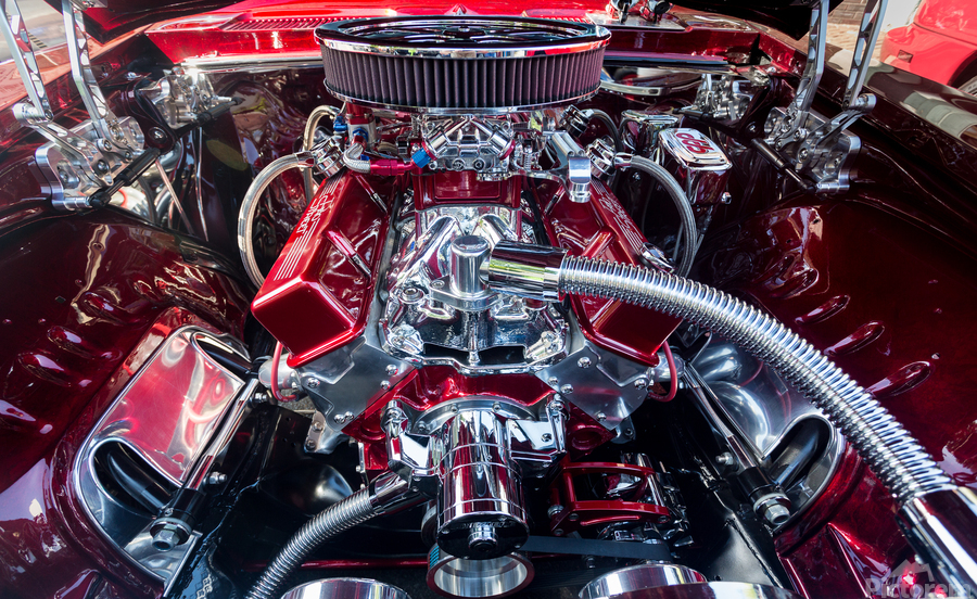 HIghly reflective engine compartment of antique hot rod Chevrolet Camaro with Pro Street accessories in dramatic highly detailed photo
