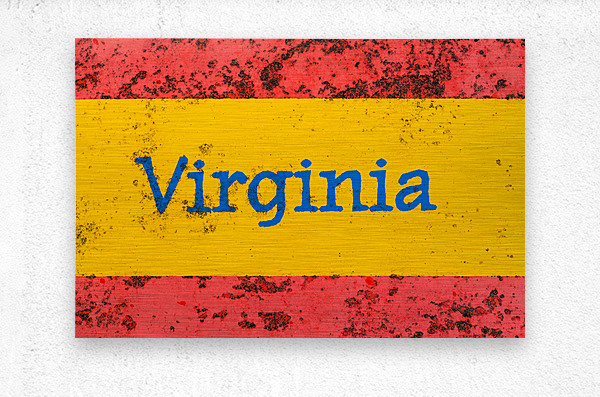 Detail of the word Virginia on a newspaper stand that is brightly painted but starting to rust