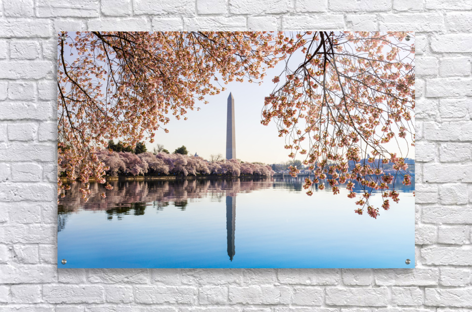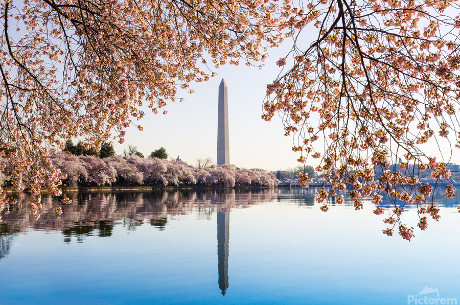 Cherry blossoms frame the Washington monument in Washington DC during Cherry Blossom Festival as the tidal basin reflects the blooms