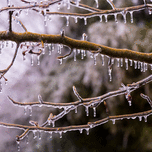 Icicles forming off ice covered branches of tree in winter as the covering starts to melt