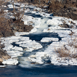 Great Falls on Potomac river outside Washington DC in winter with ice forming on the cascades and snow on the rocks