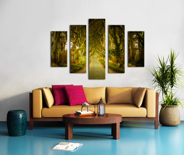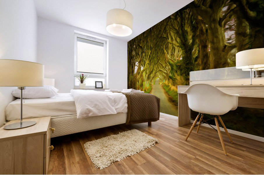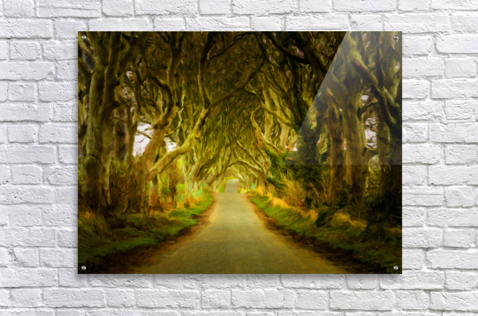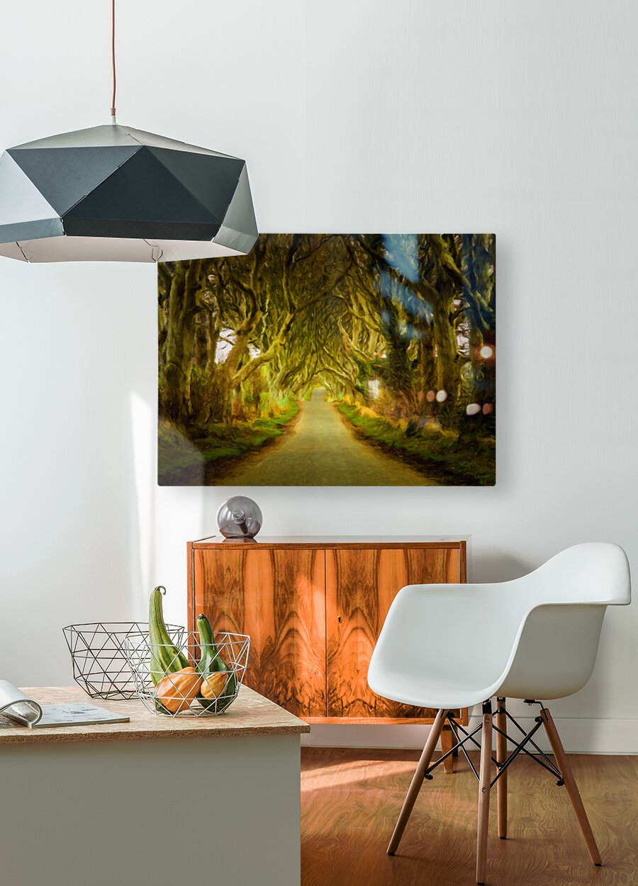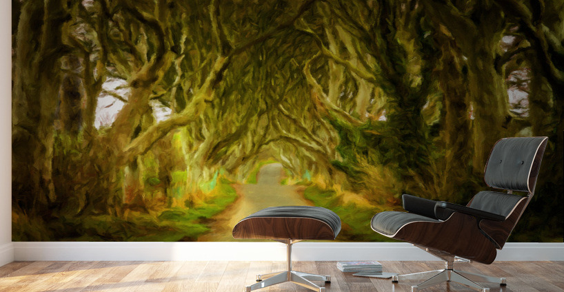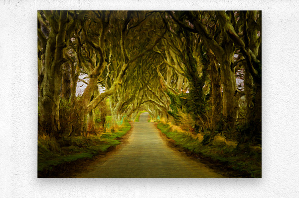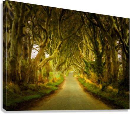 Magical landscape in Northern Ireland known as Dark Hedges with Bregagh Road passing beneath ancient beech trees and converted into a beautiful digital art work to grace a wall