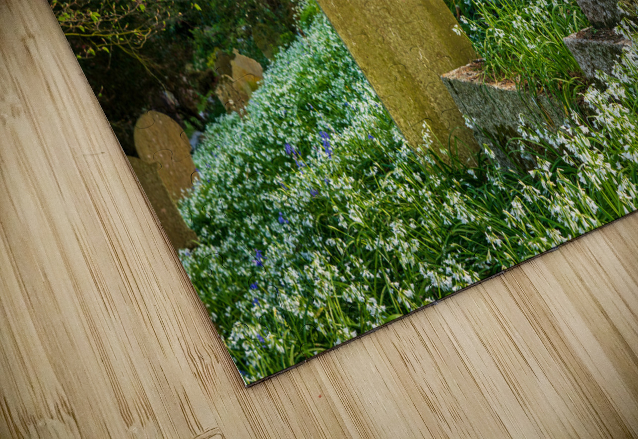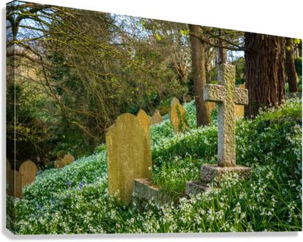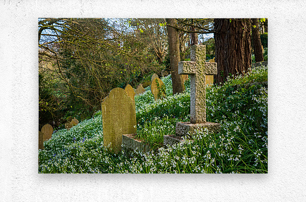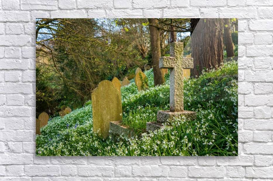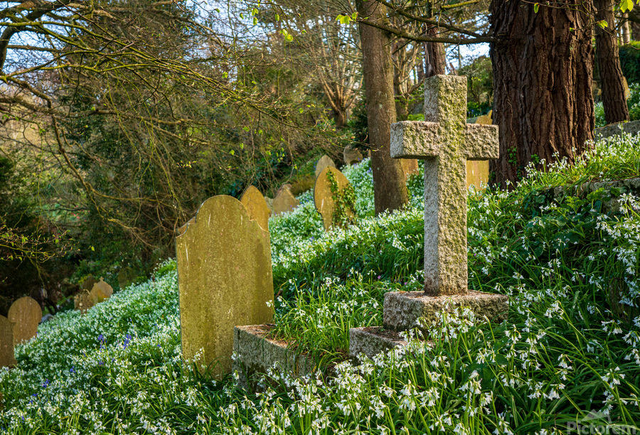 Headstones on the hillside among white bluebells at the little parish church of St Just in Roseland Cornwall