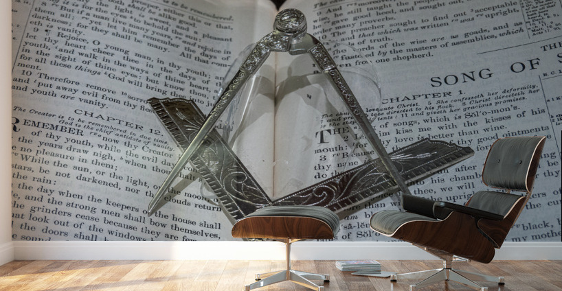 A silver square and compass displayed on an old copy of the Bible set to the Song of Solomon used by the Freemasons