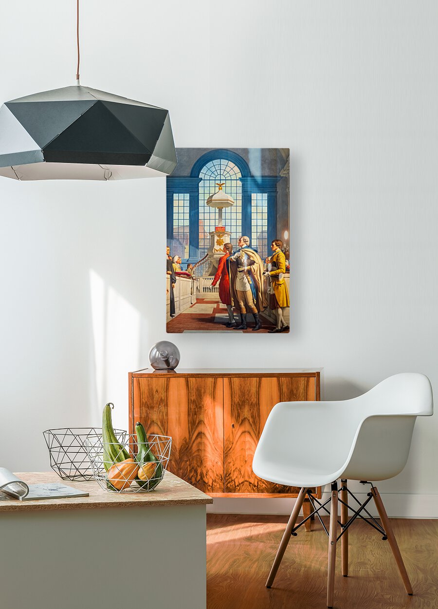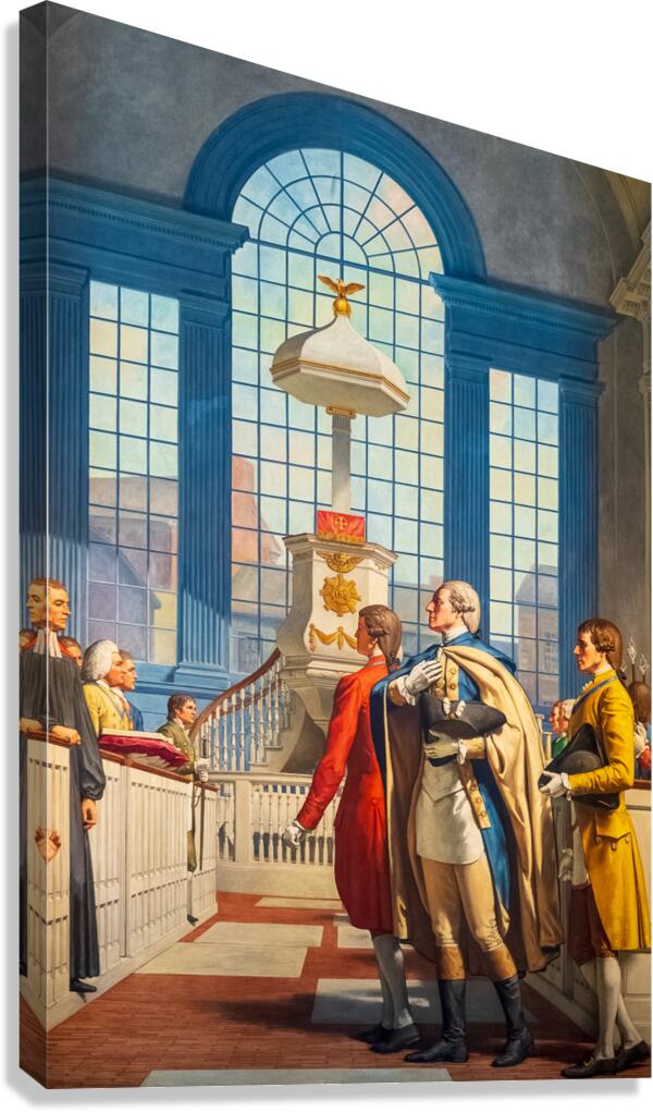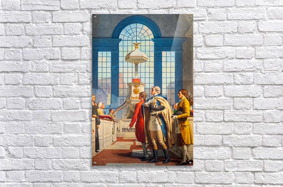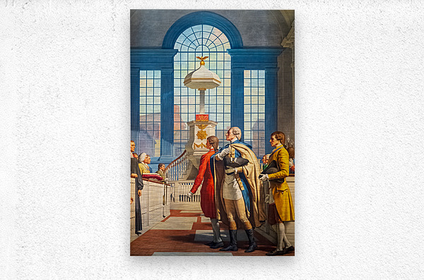 Detail of large painted mural showing George Washington attending prayer service at Christs Church in Philadelphia. This is in the national Masonic memorial building in Alexandria Virginia