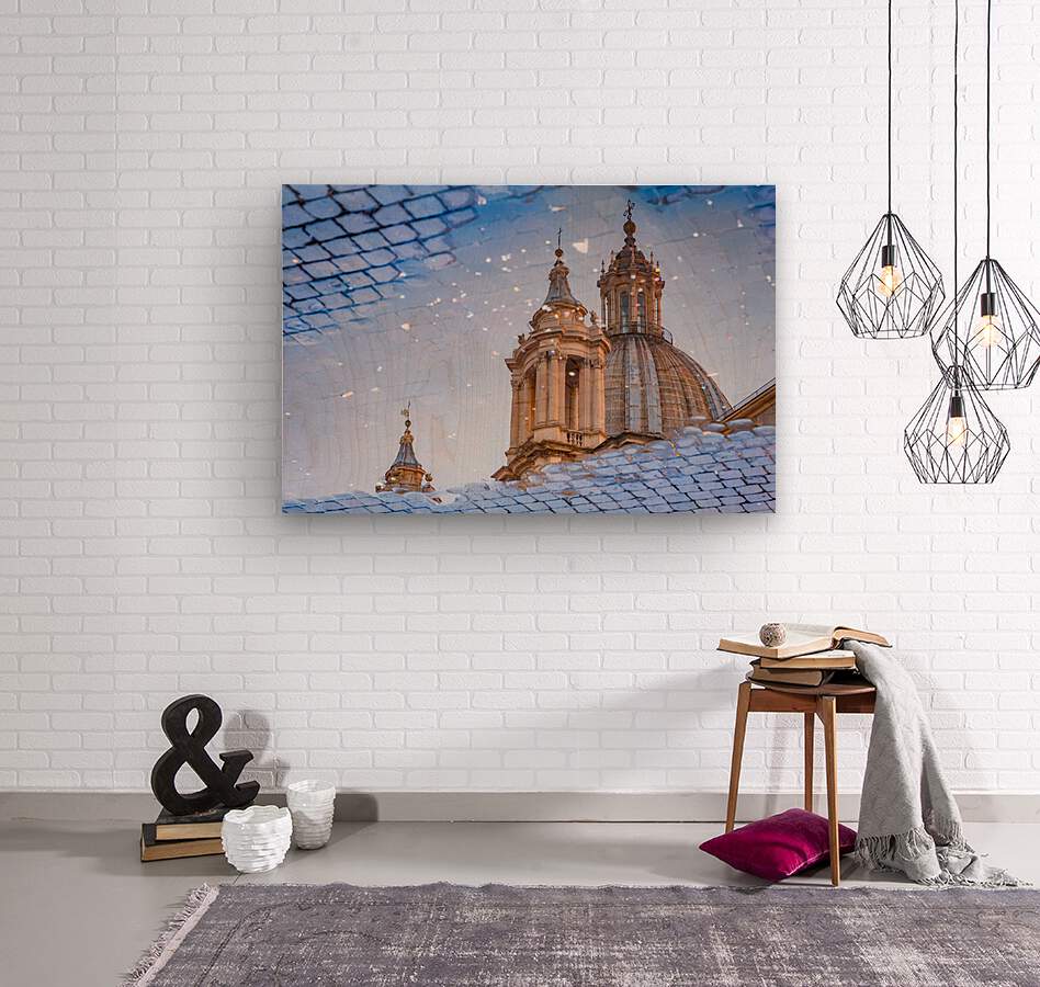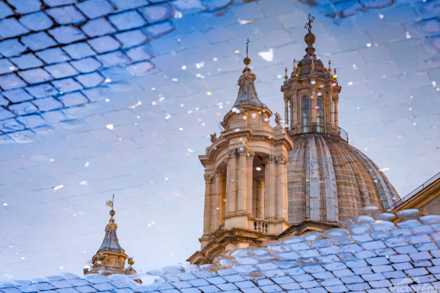Sant Agnese in Agone lit up by setting sun in Piazza Navona reflected in puddle
