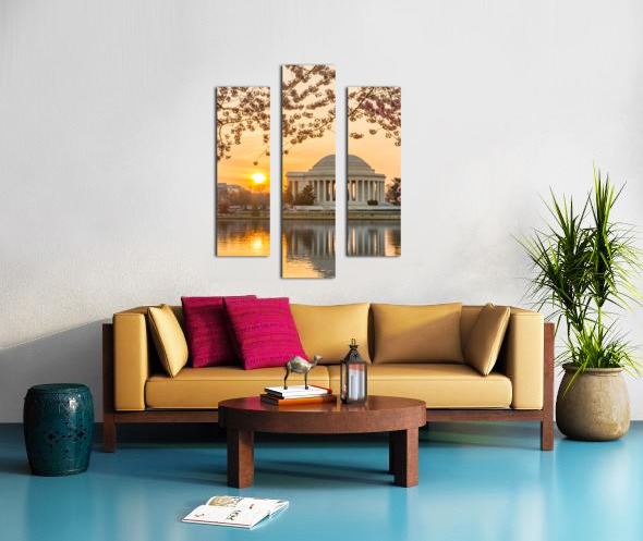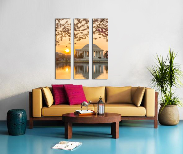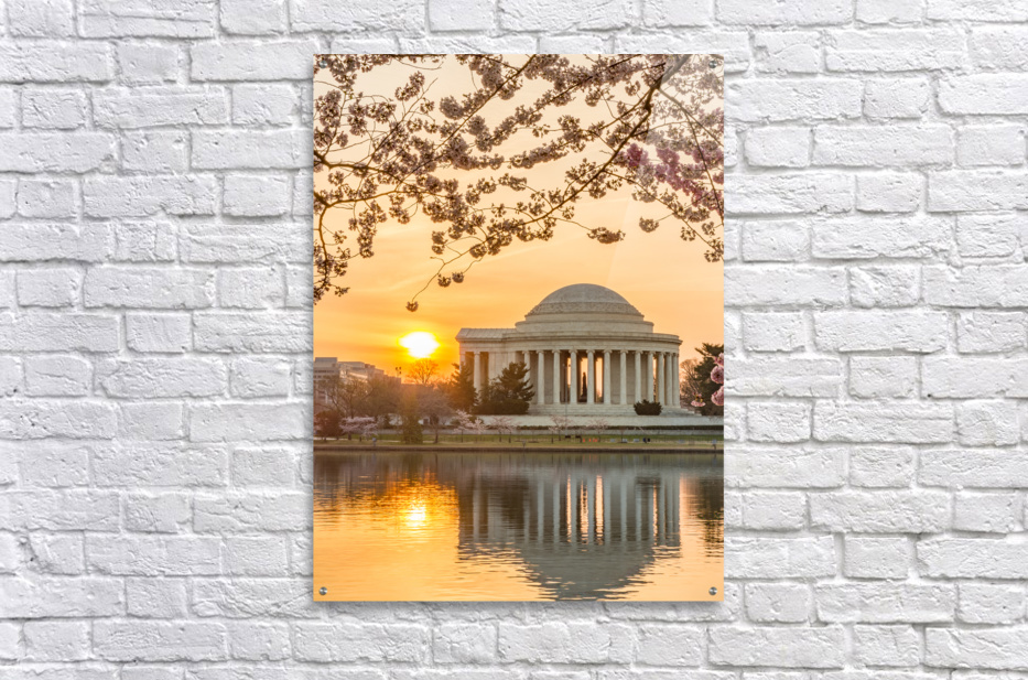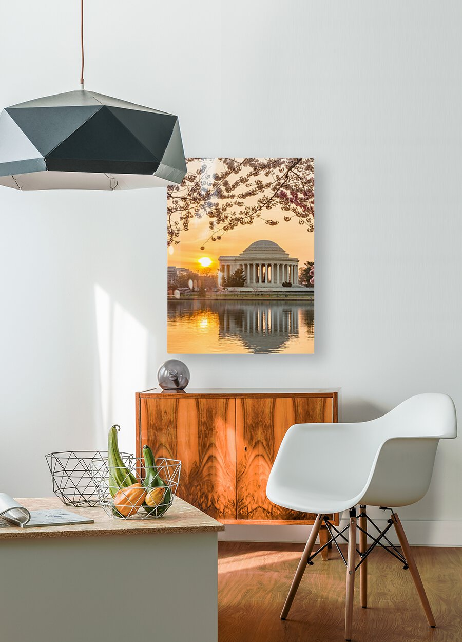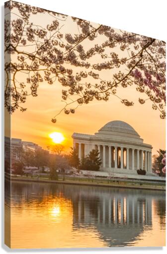 Premium high-resolution wall art print featuring Jefferson Memorial at dawn by Tidal Basin and surrounded by pink Japanese Cherry blossoms with the monument lit by the rising sun at dawn