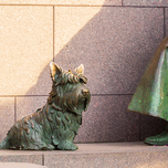 Detail of pet dog by statue in memorial monument to President Franklin Delano Roosevelt in Washington DC