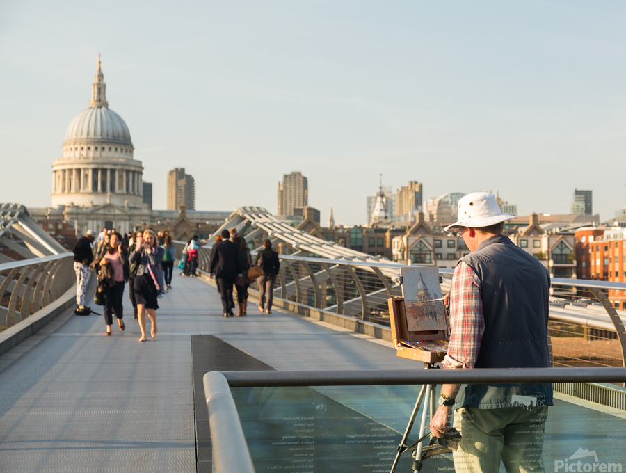 LONDON UK - 23 APRIL: Londoners walk home from St Pauls past artist on 23 April 2013. The dome at 365 feet high towers over Millenium Bridge