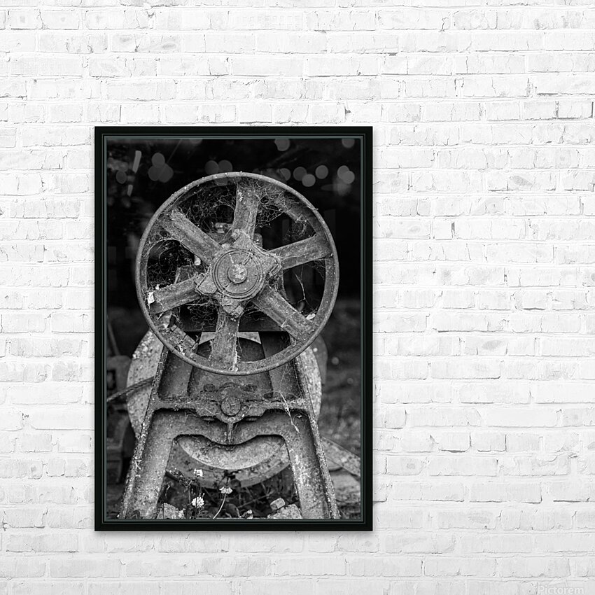 Get this artwork "Rusty farm machinery with flywheel" in a framed print.
