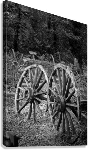 Black and white view of a pair of old wooden cartwheels against a ruined wood cart or buggy in farm forest
