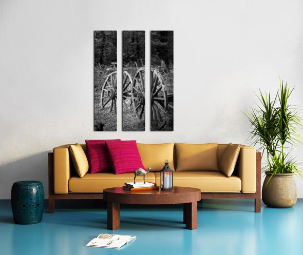 Two old wooden cartwheels against wood cart Frame print