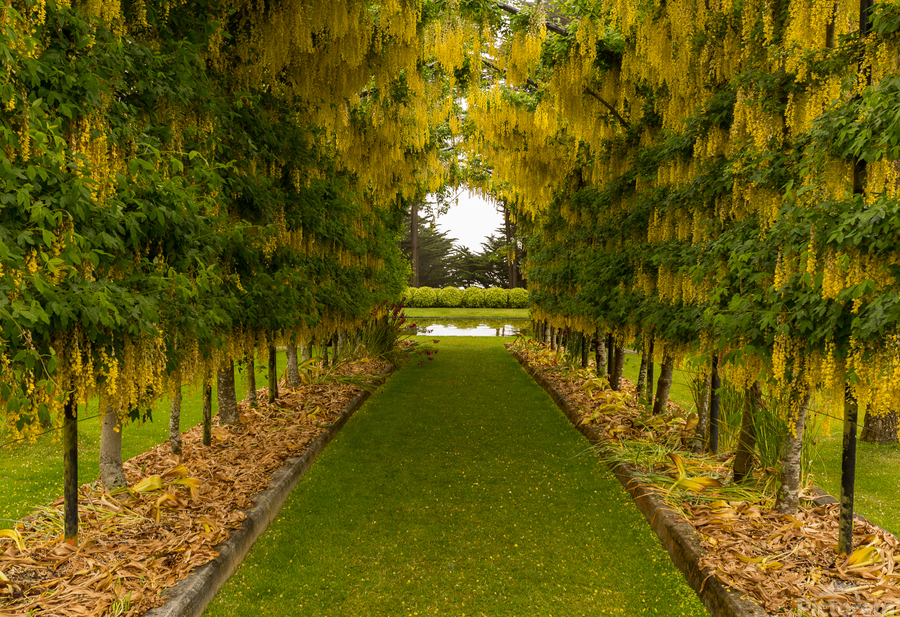LABURNUM ARCH IN FULL BLOOM OVER GRASS PATH