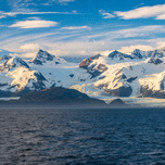 Late evening sun on panorama of mountains and Mount Fairweather by Glacier Bay National Park in Alaska