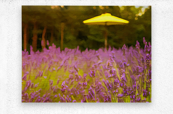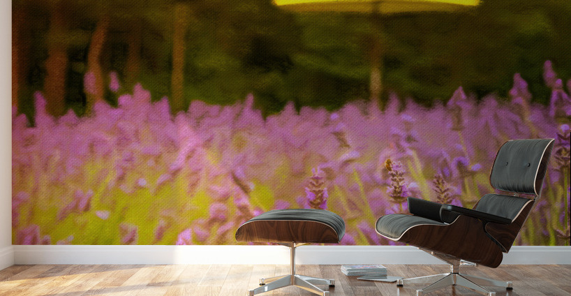 Digital pastel and crayon version of lavender plants in blossom cultivated in a small farm in Maryland as sun shines over the trees