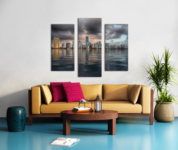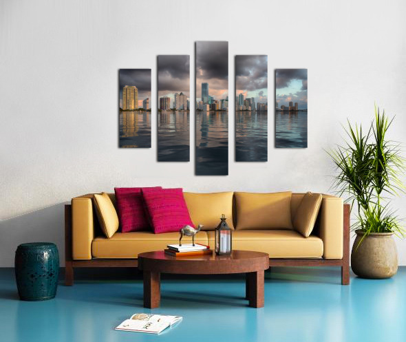 ABOUT THIS ARTWORK: DAWN VIEW OF MIAMI SKYLINE REFLECTED IN WATER