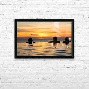 Silhouetted heads against infinity edge pool Picture Frame Printing