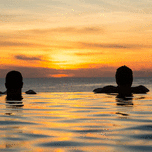 Silhouette of peoples heads at the edge of infinity swimming pool overlooking ocean at sunset