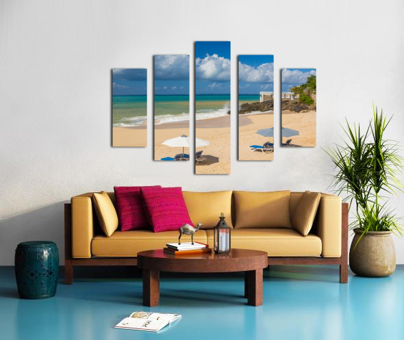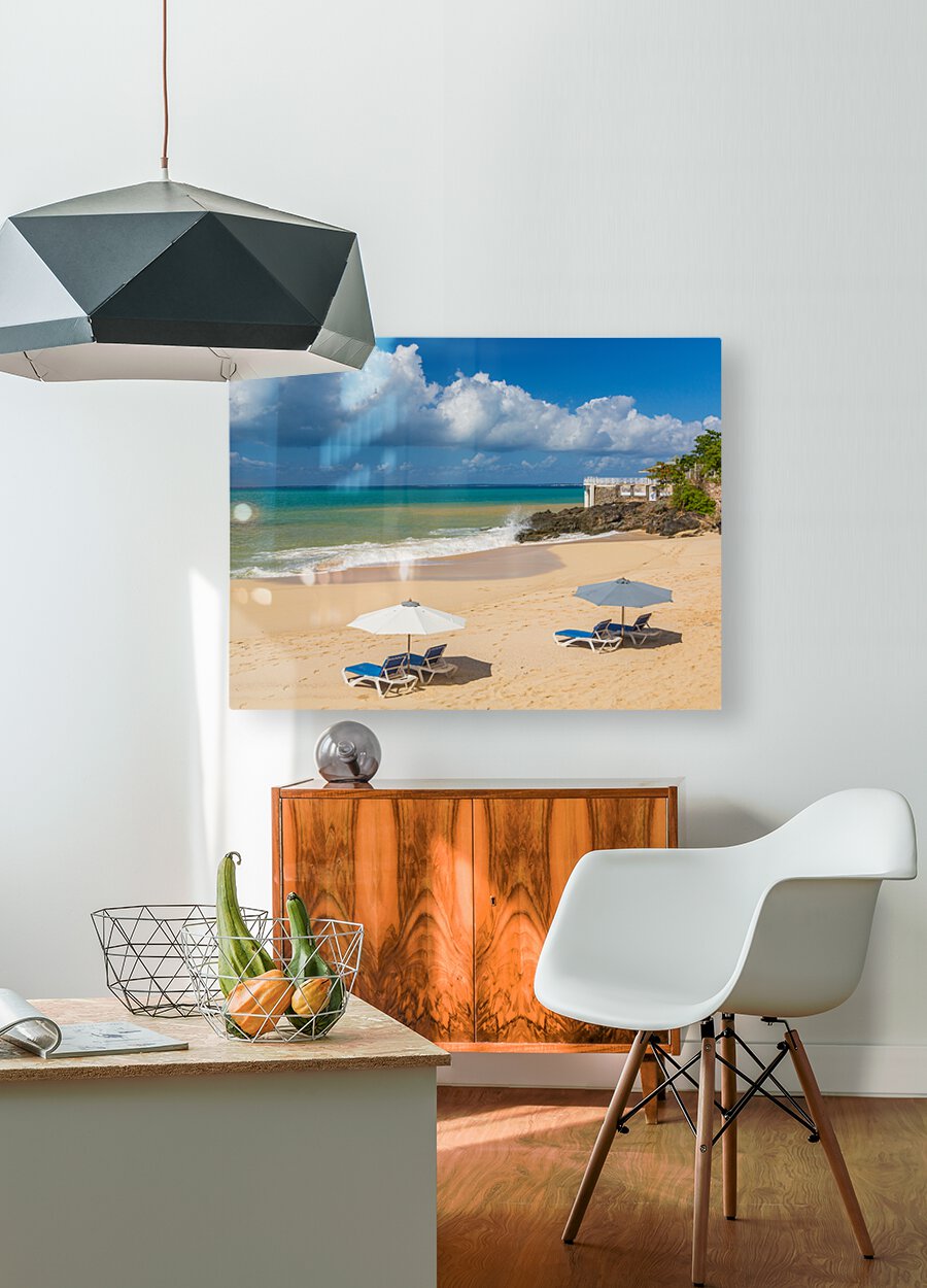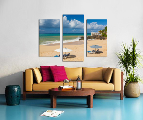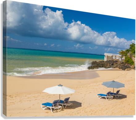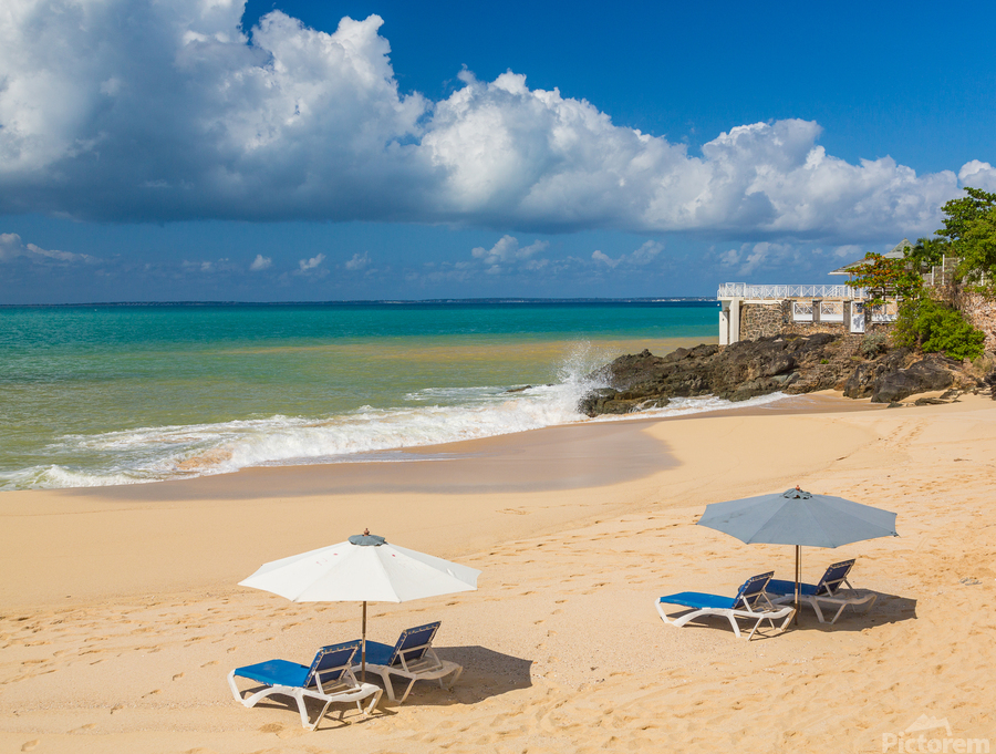 Get this artwork "Reclining chairs and umbrella on Baie Rouge" in a framed print.
