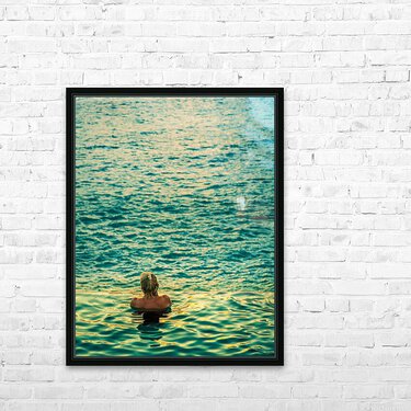 Womans head against infinity edge pool Picture Frame Printing