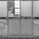 Black and White image of the detail of rusting window frame in brick warehouse or factory with one clear pane of glass showing something of the interior