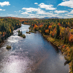 SARANAC RIVER FLOWS THROUGH MULTI-COLORED FALL LANDSCAPE IN ADIR