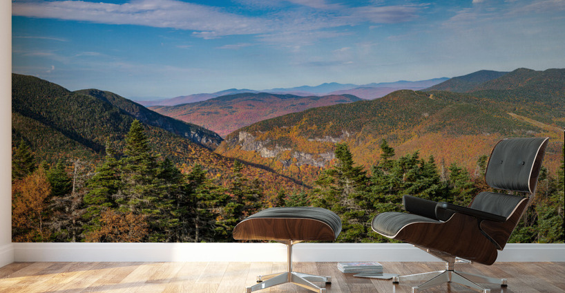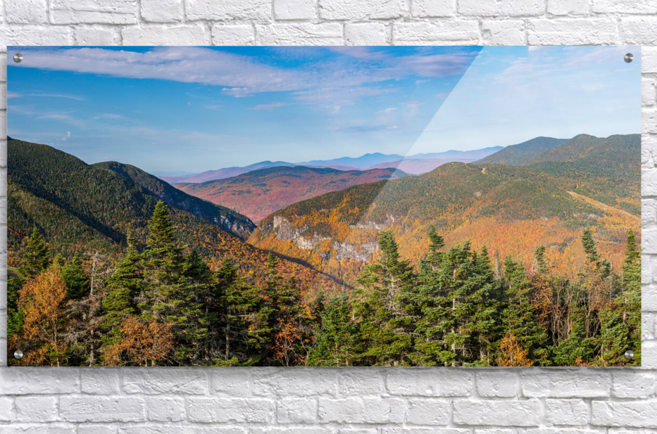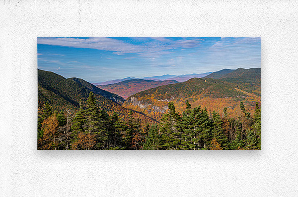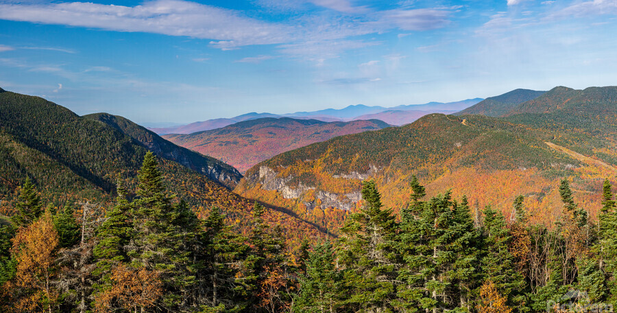 Aerial panorama of Smugglers Notch looking towards the north and away from Stowe in fall colors taken from mountain top