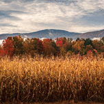 Layers of trees in many autumn colors behind corn in cornfield in Vermont in the fall