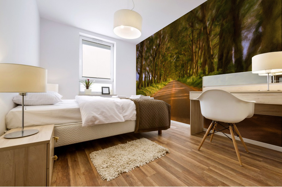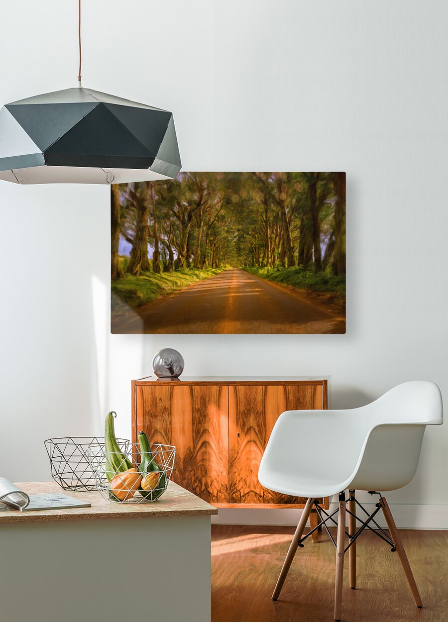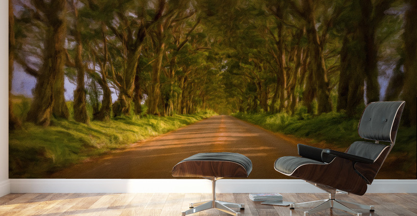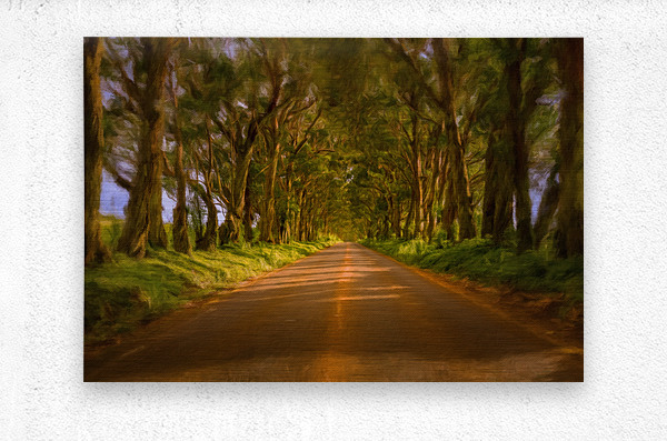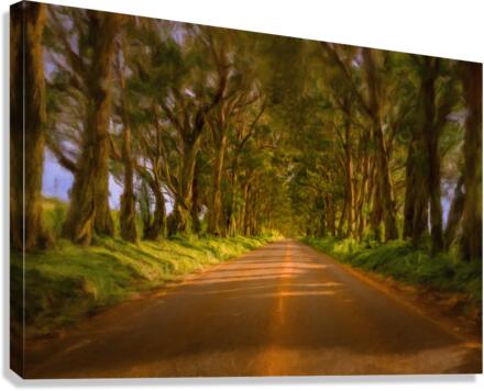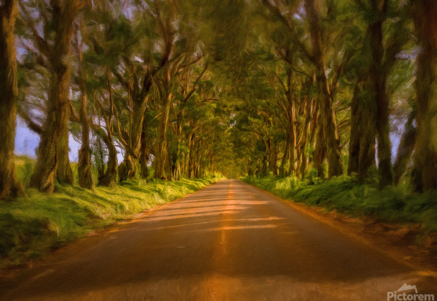 Digital painting of famous mile long tree tunnel of Eucalyptus trees along Maluhia Road to Koloa Town Kauai Hawaii. Later afternoon sunlight gives a very peaceful view of this tree covered road