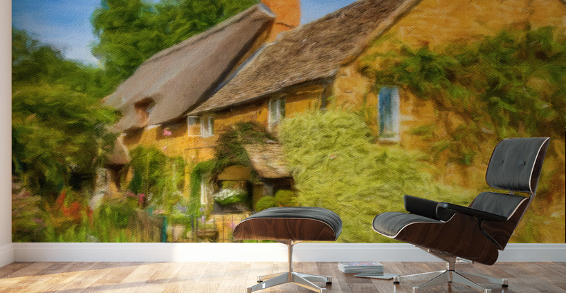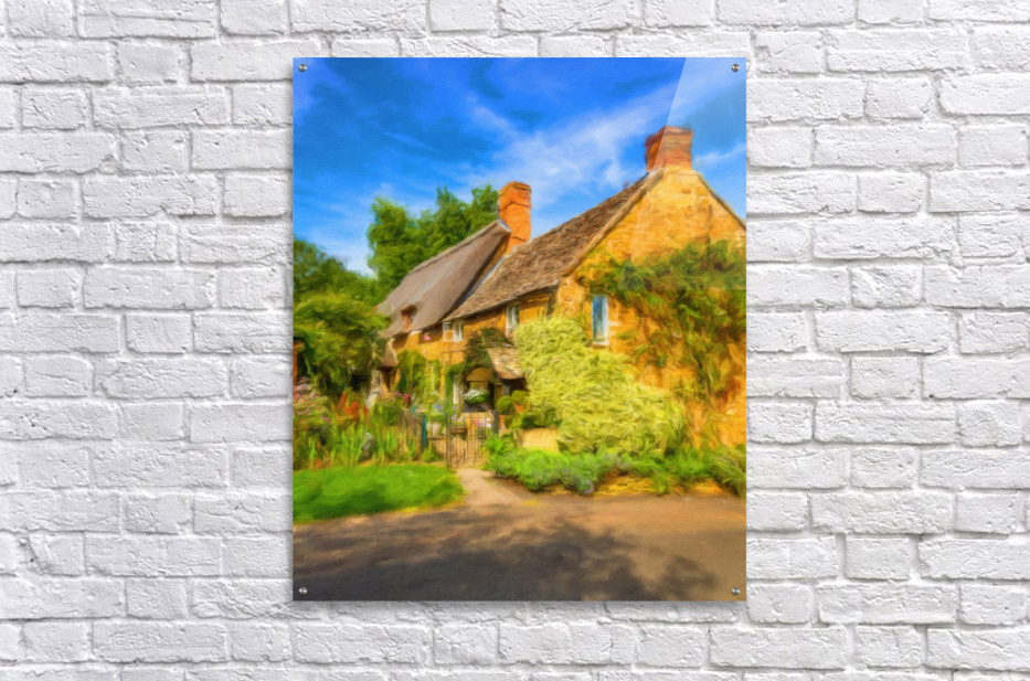 Digital impressionistic painting of an old cotswold stone cottage and flower garden in Cotswold village of Ilmington