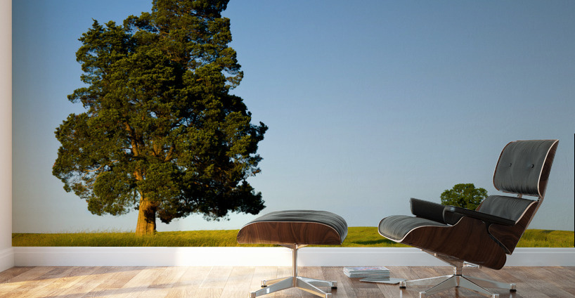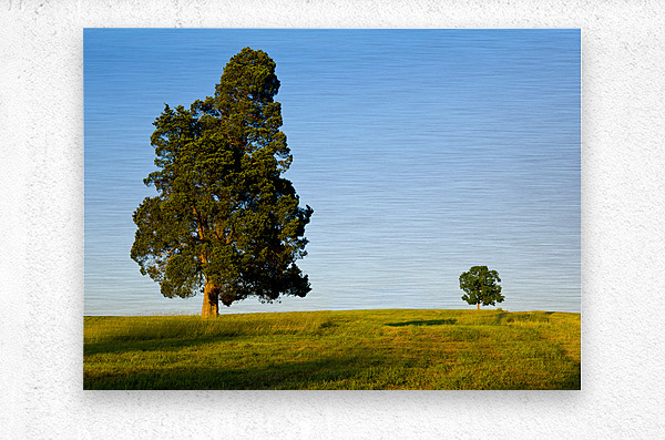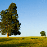 Large pine type tree with another smaller tree on horizon line in meadow or field to illustrate concept of big and small or parent and child