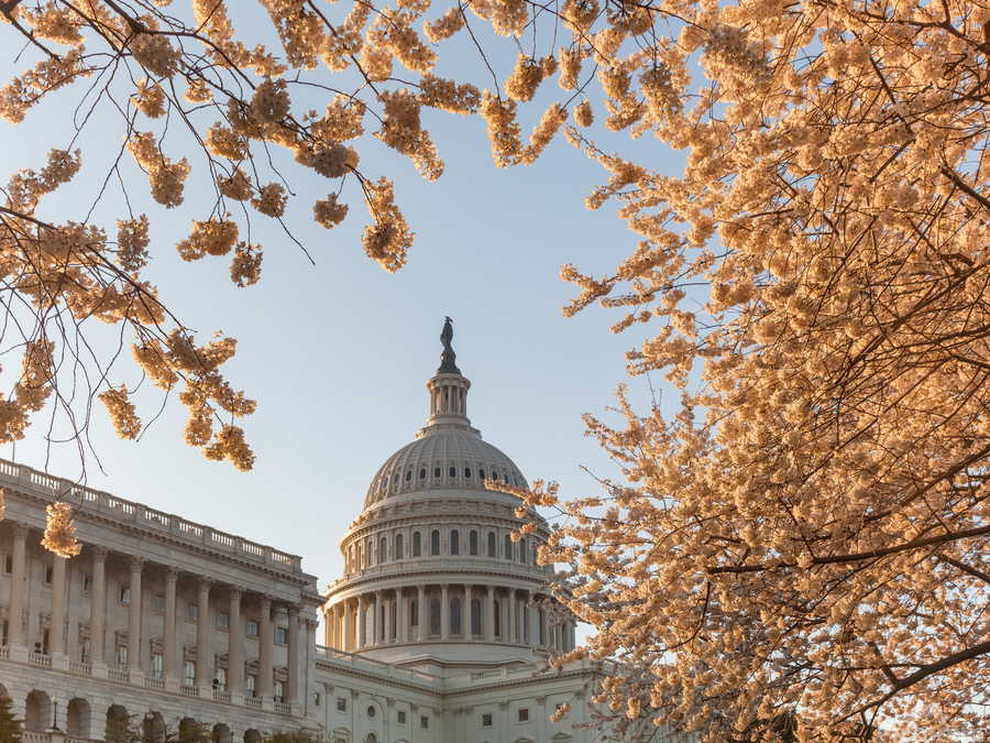 Capitol building in Washington DC illuminated early in the morning with cherry blossoms framing the dome of the building