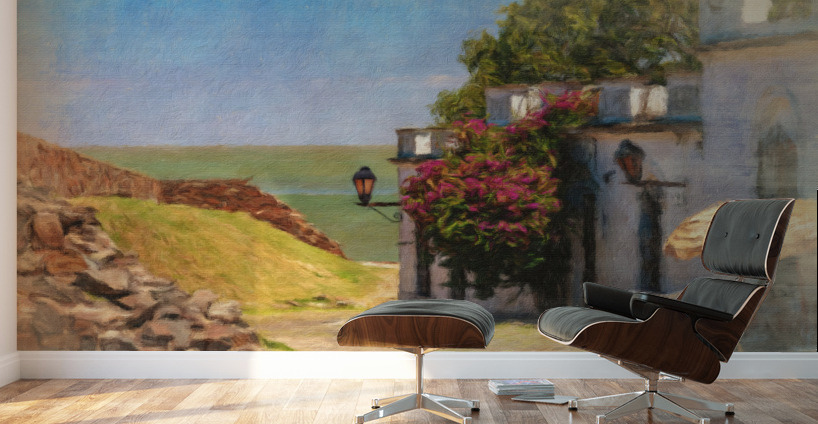 Digital oil impressionistic painting of the cobbled street leading to the River Plate in the Unesco World Heritage site of Colonia del Sacramento in Uruguay. The traditional street lantern and bougainvillea flowers add to the pretty scene