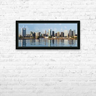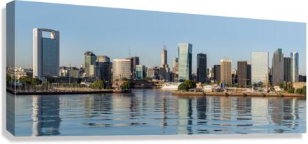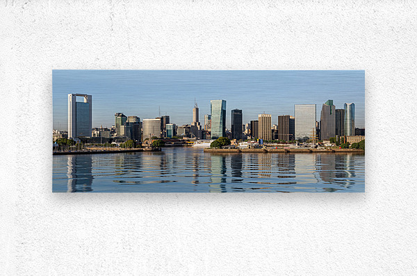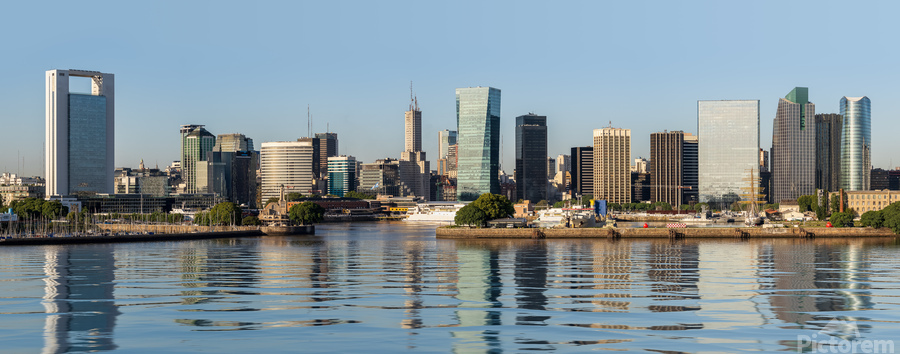 Wide panorama of the Buenos Aires city skyline with an artificial reflection in the water