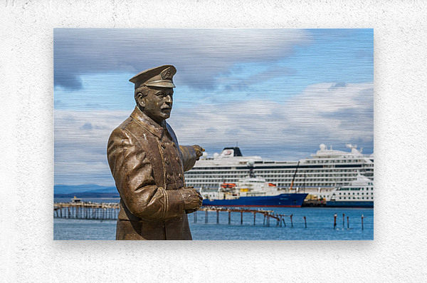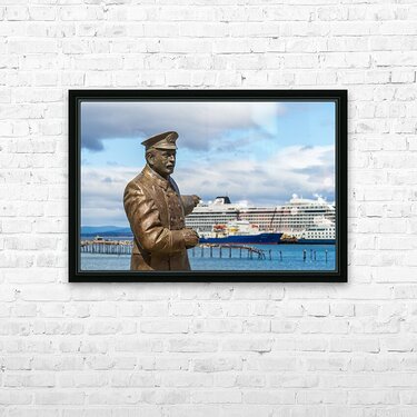 Statue of Ernest Shackleton pointing at Viking Jupiter ship in P Picture Frame Printing