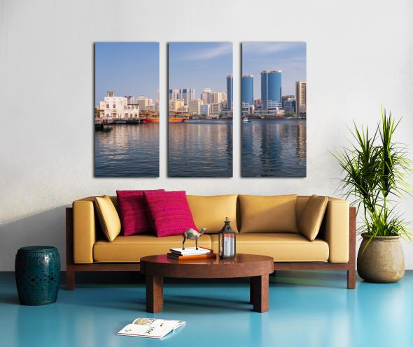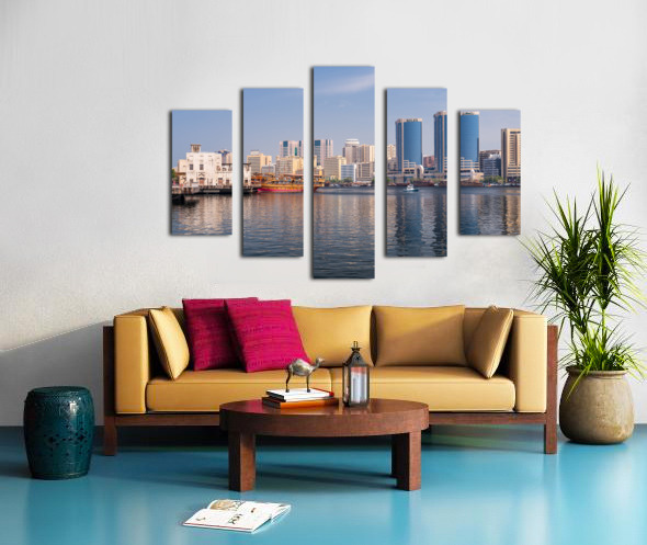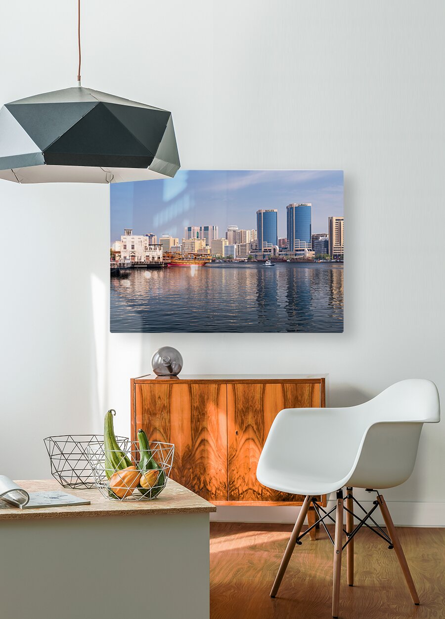 Get this artwork "The Creek by Bur Dubai and Al Seef with large docked cruise boat" in a framed print.