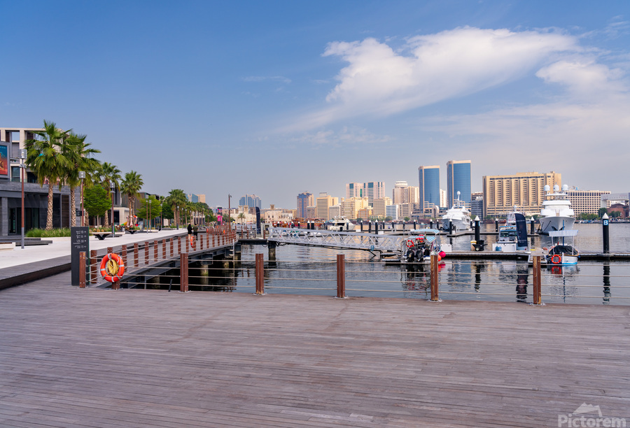 Get this artwork "The Creek by Bur Dubai and Al Seef with large docked boats" in a framed print.
