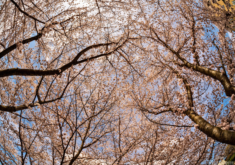 LOOKING UP AT CHERRY BLOSSOMS OVER WALKING TRAIL IN MORGANTOWN