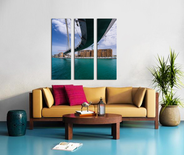 Modern apartments alongside Dubai Canal under Tolerance bridge Picture Frame Printing