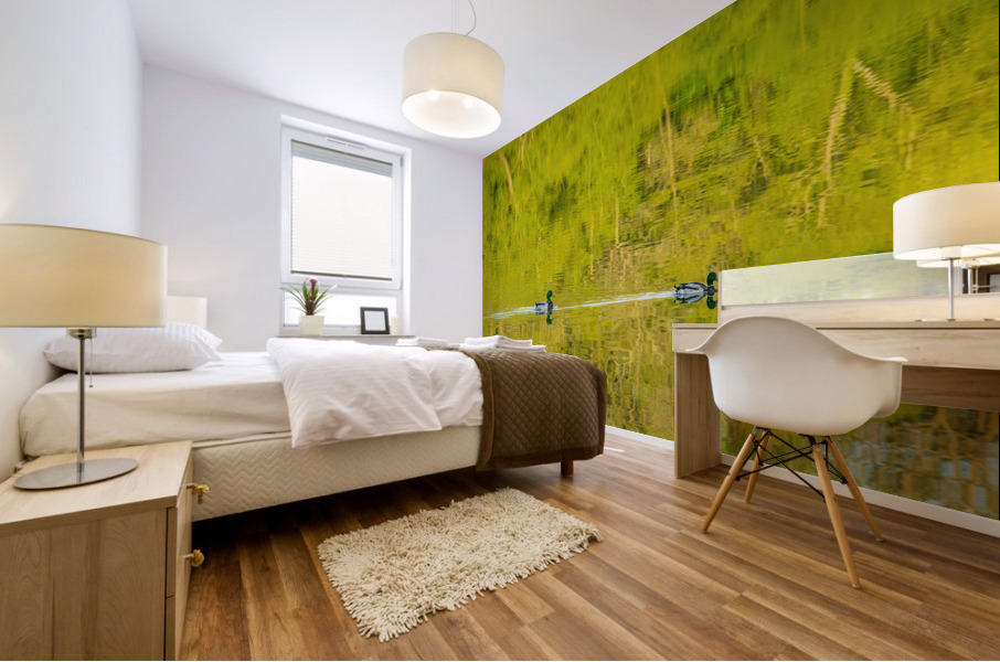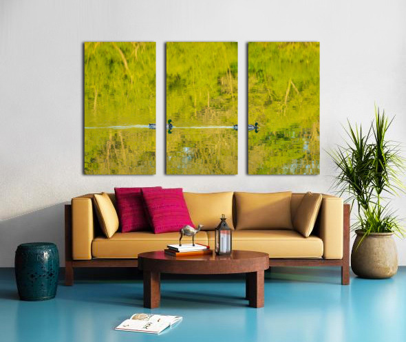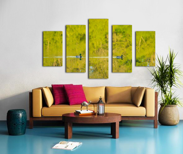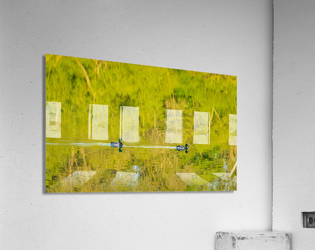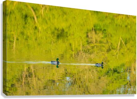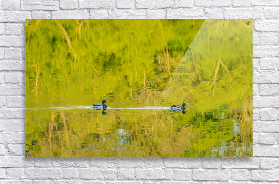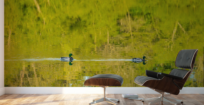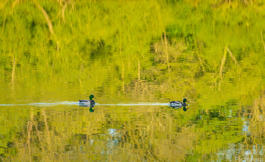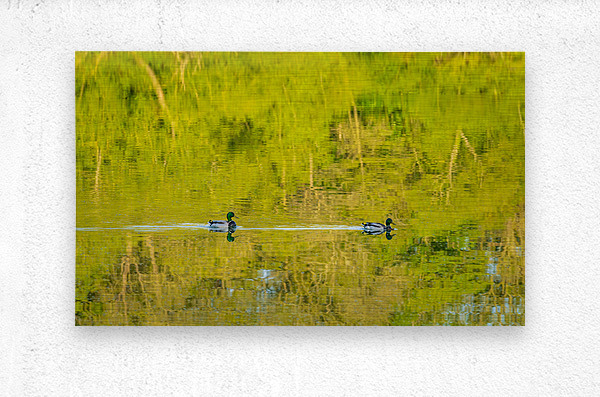 Get this artwork "Two ducks floating through reflection of sunlit trees" in a framed print.