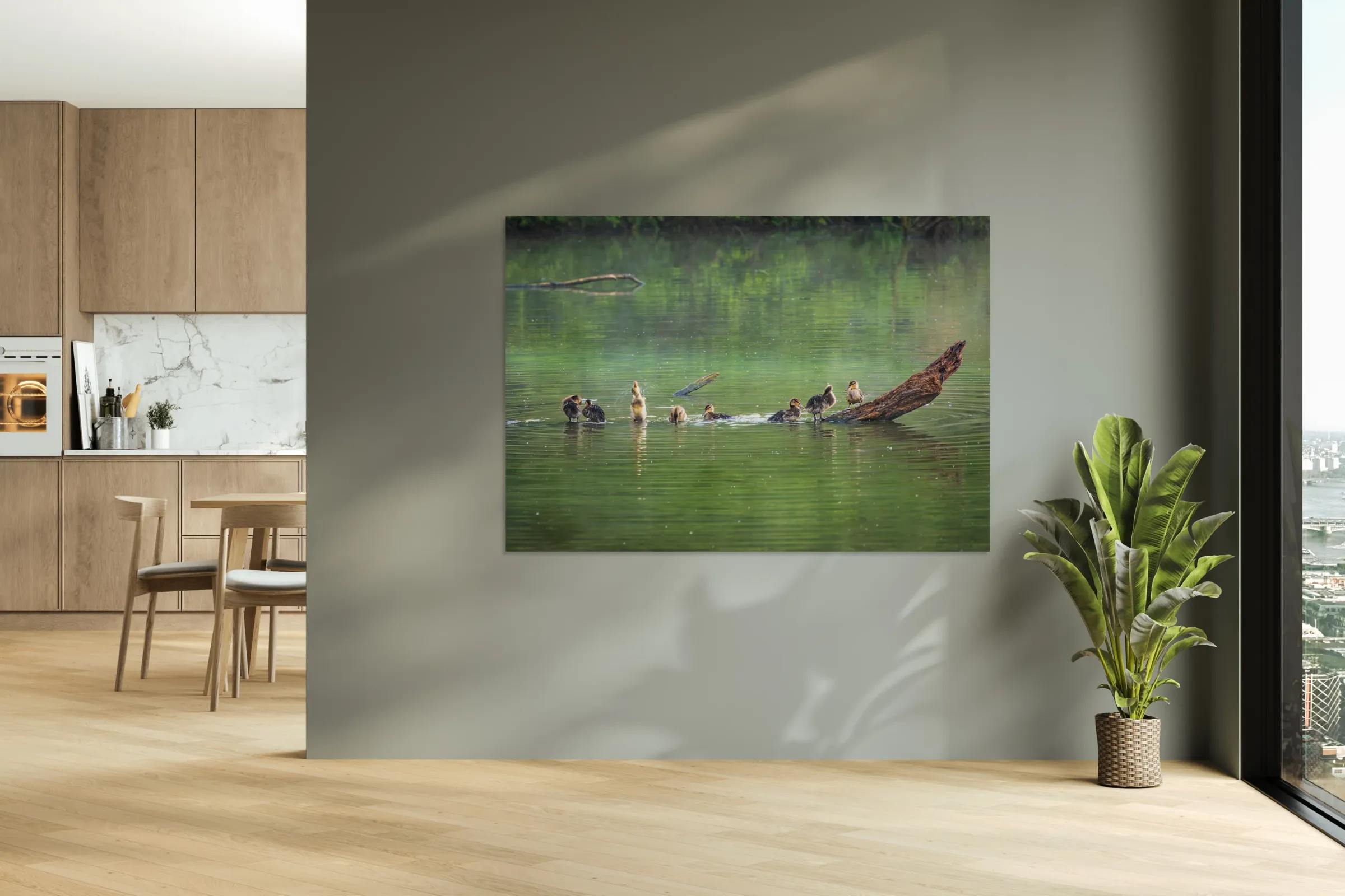 Get this artwork "Group of ducklings washing in lake at dusk" in a framed print.