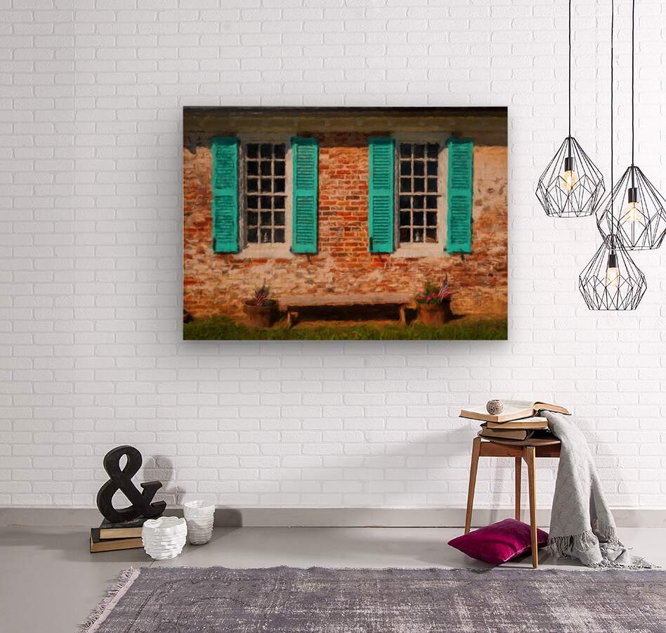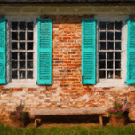 Digital oil painting of simple blue shutters around white windows against a brick wall in colonial house in Virginia