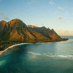 Aerial panoramic image of early morning light just catching the mountains dominating Tunnels beach on Hawaiian island of Kauai with Na Pali mountains ...[+]