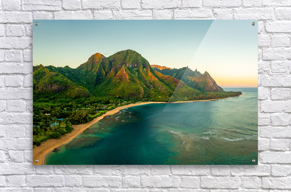 ABOUT THIS ARTWORK: SUNRISE AERIAL VIEW OF TUNNELS BEACH AT DAWN ON KAUAI IN HAWAII