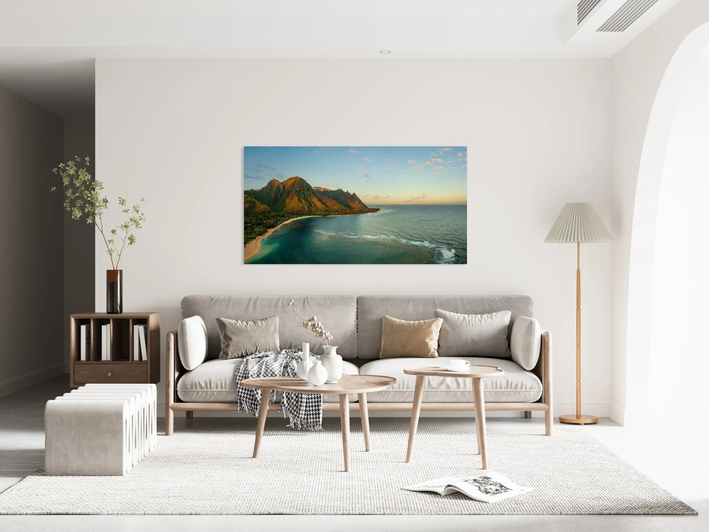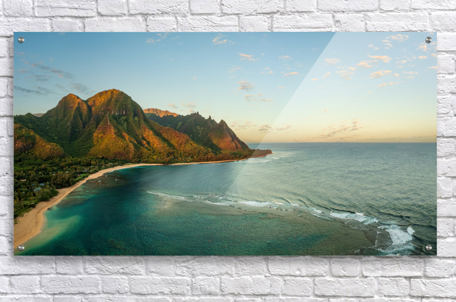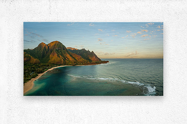 ABOUT THIS ARTWORK: PANORAMA AERIAL VIEW OF TUNNELS BEACH AT SUNRISE ON KAUAI IN HAWAII