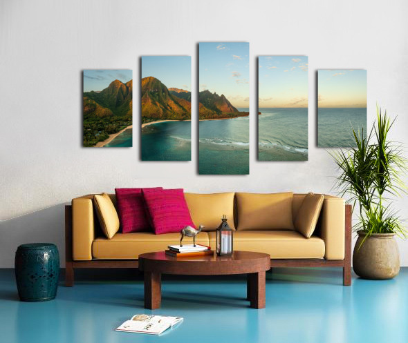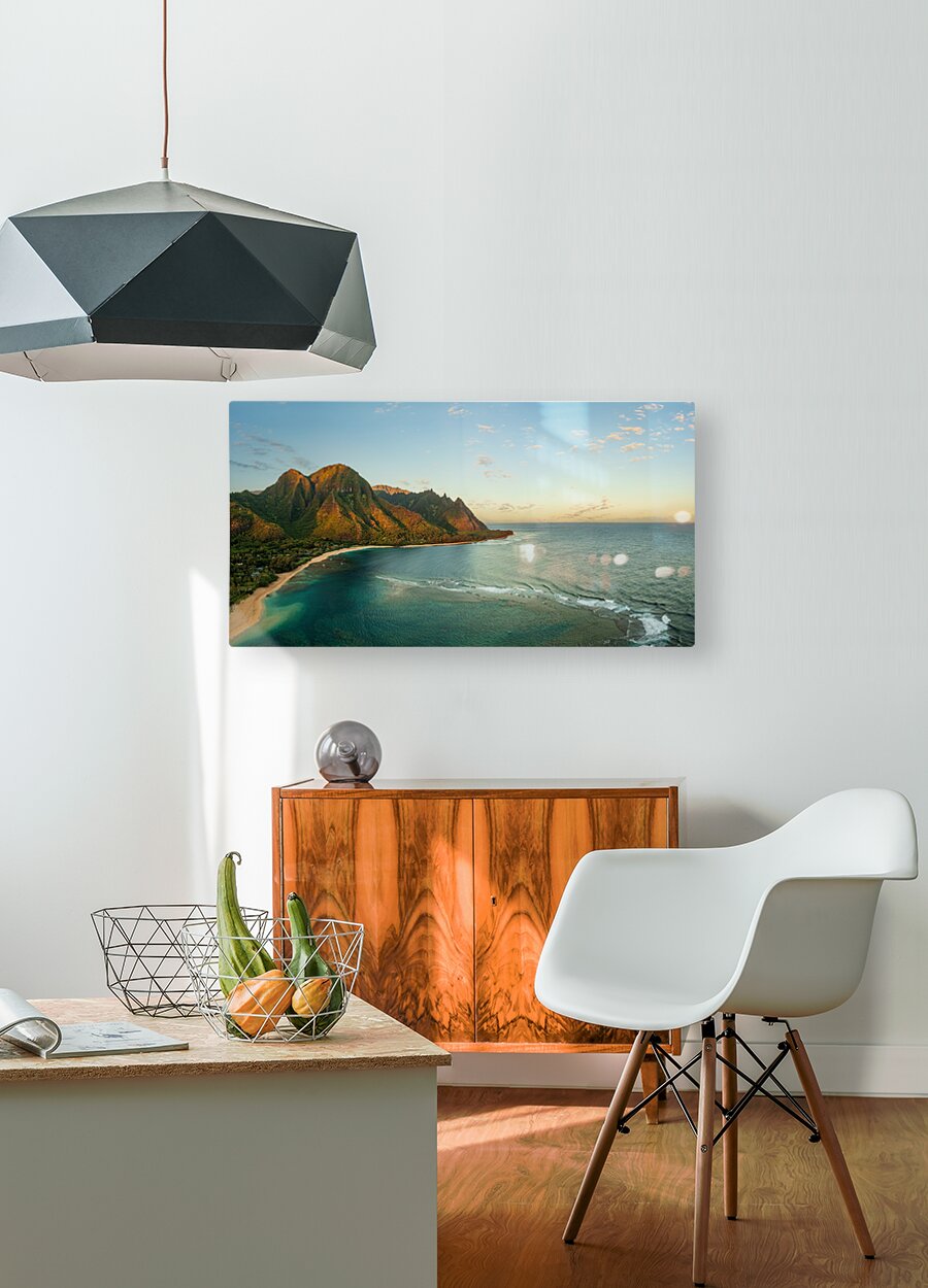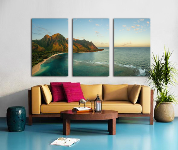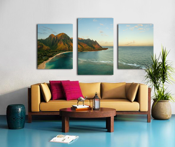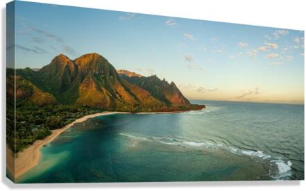 Get this artwork "Panorama aerial view of Tunnels Beach at sunrise on Kauai in Hawaii" in a framed print.