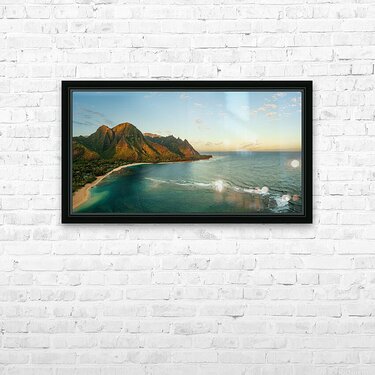 Panorama aerial view of Tunnels Beach at sunrise on Kauai in Hawaii Picture Frame Printing