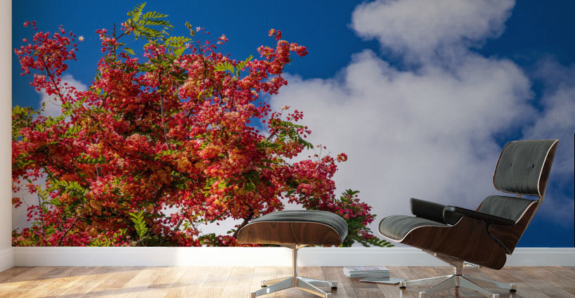 Crimson and yellow blossoms of the Rainbow Shower tree back lit by the sun against a blue sky on Kauai
